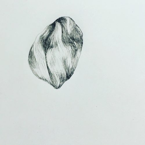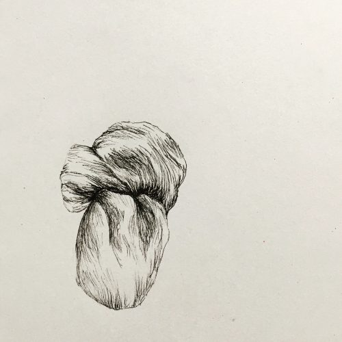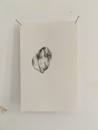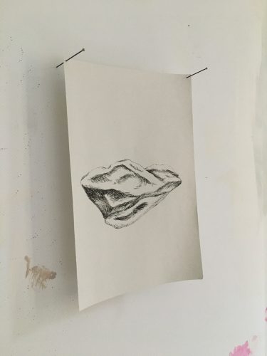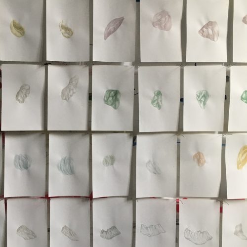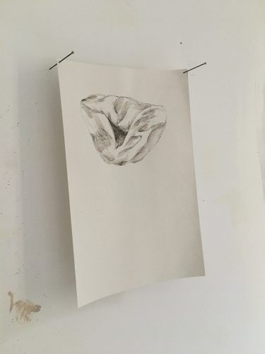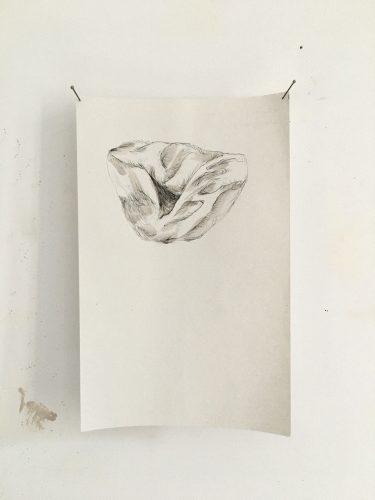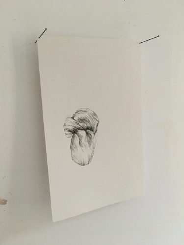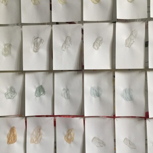 Dans un premier temps, j’observe ces bouts de tissus peints ou sculptés, je les dessine dans des petits carnets de papier recyclé. J’arrache le motif initial de son contexte, l’interprète, et dans un processus lent et répétitif, accumule une multitude de petits dessins de lambeaux disloqués, des fragments.