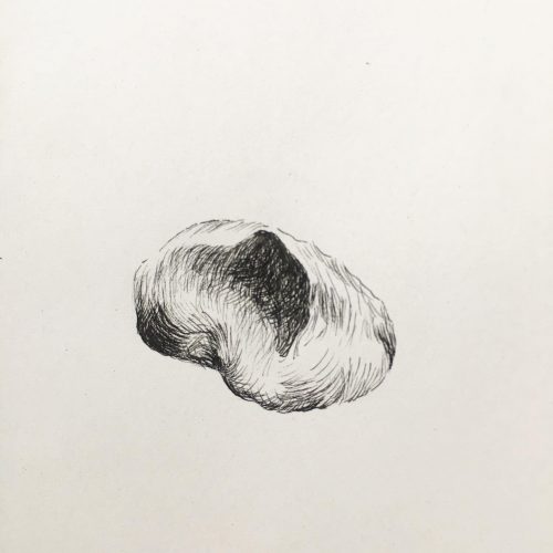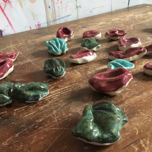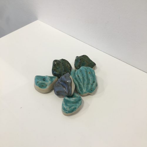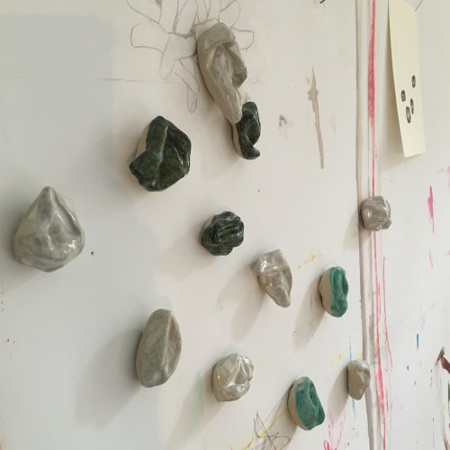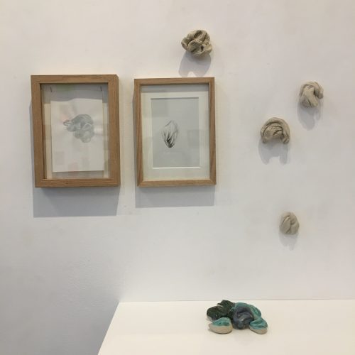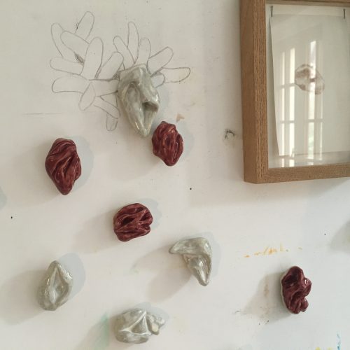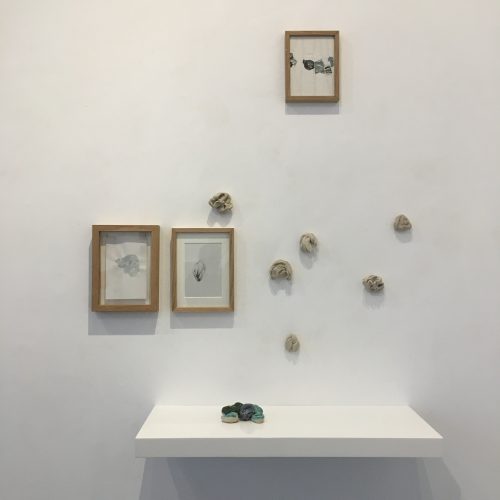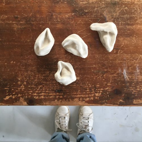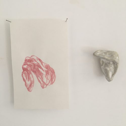 Dans un second temps, je modèle à partir de ces dessins, des petites formes en volume, en grès. Le pli d’origine se transforme encore, devient un petit objet curieux, non identifiable, interroge et ouvre à plusieurs interprétations.