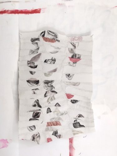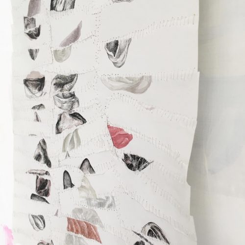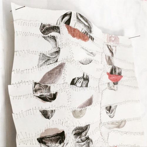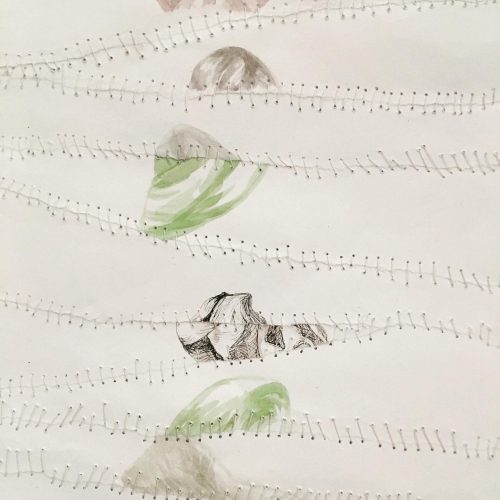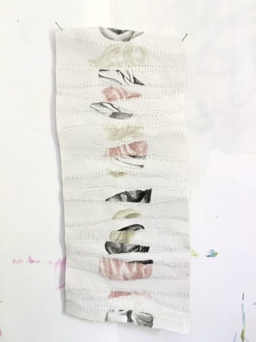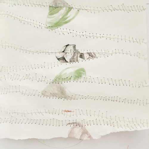 fragments de dessins ratés, encre / aquarelle / papier recyclé / fil de couture