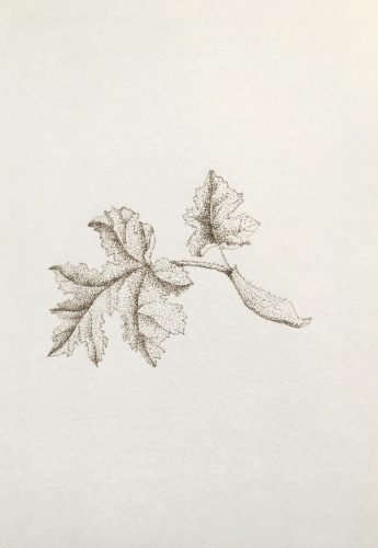 Je dessine à l’encre, petit point par petit point, des fragments de chacune de ces plantes, créant des planches botaniques, qui retracent mes observations et les rues que j’ai empruntées.