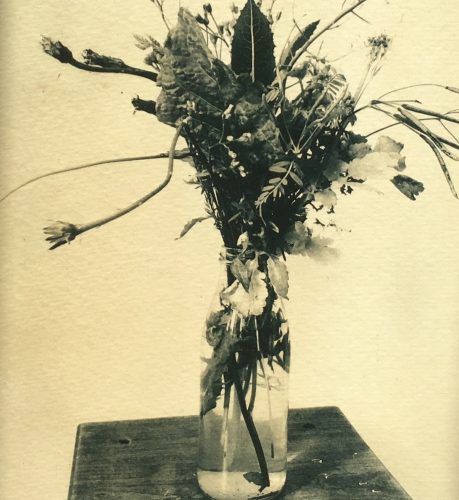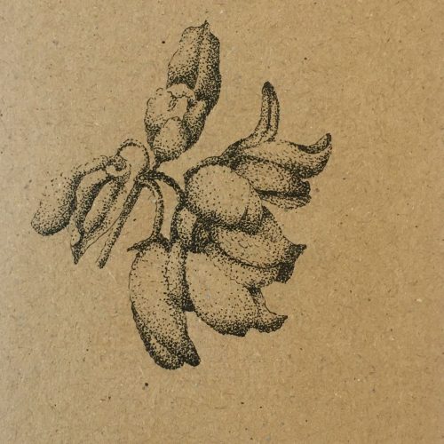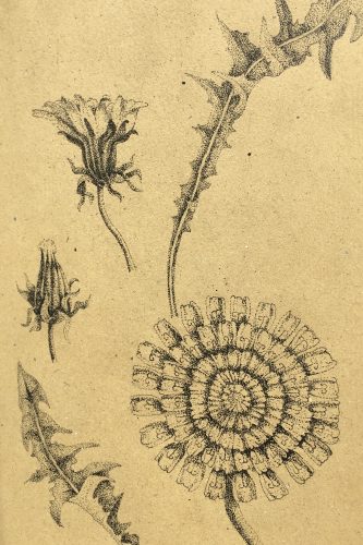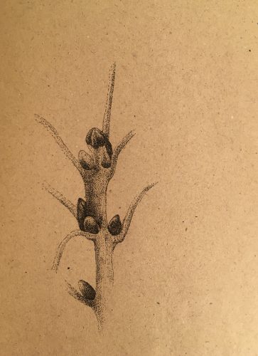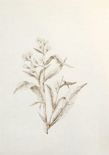Les Vagabondes, Herbier des interstices (coquelicot blanc, coronille, chélidoine, frêne, cerisier, lierre, laitue vireuse, pissenlit, porcelle enracinée, plantain lancéolé, berce, verge d’or, clématite, arbre à papillons, trèfle, coquelicot, grand plantain), encre sur papiers donnés, 18×12,4 cm.