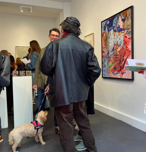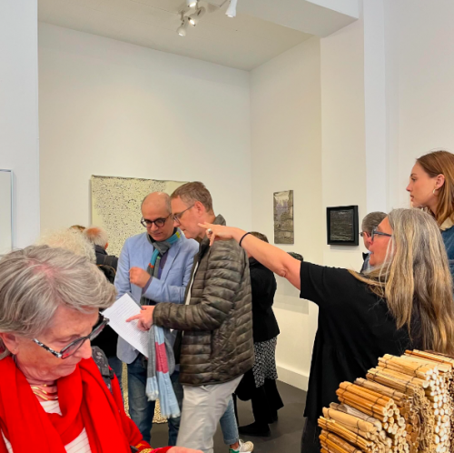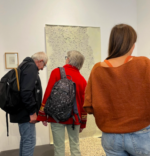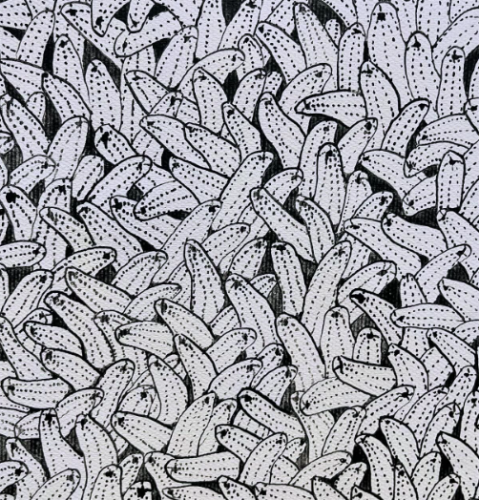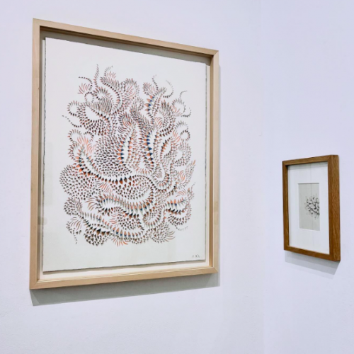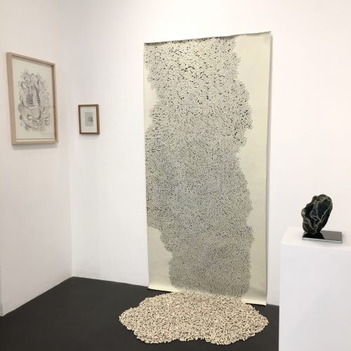 Les effets visuels sont toujours différents, variations débordant d’un imaginaire sans rhétorique, d’une simplicité minimale aux résonances immenses. La somme de chaque petit geste, de chaque petit motif, de chaque petit trait, crée quelque chose de grand. Dans ce jeu d’optique, l’œil suit la répétition, rebondit d’un motif à l’autre. La répétition loin de lasser, apaise, rassure le regard, offre une intimité quand le sens de l’œuvre échappe. L’attention et l’égarement se conjuguent.