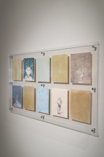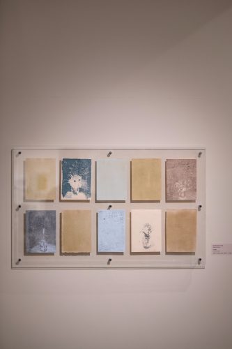 Papiers teintés avec les pigments des « bouquets-trottoirs », empreintes / traces d’encres d’impression sur papiers donnés et sur transparents, 18×13 cm chaque.