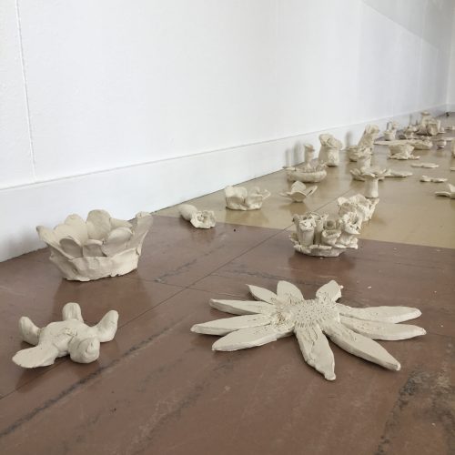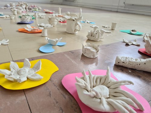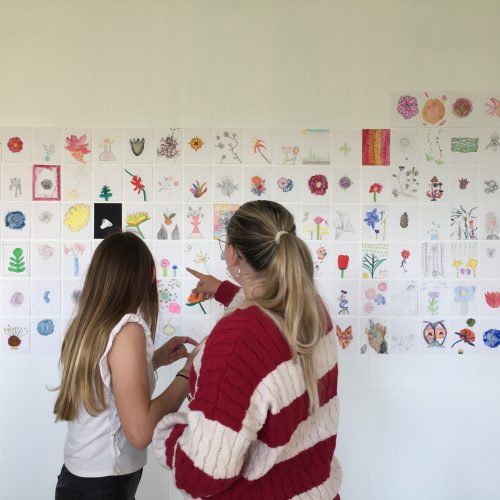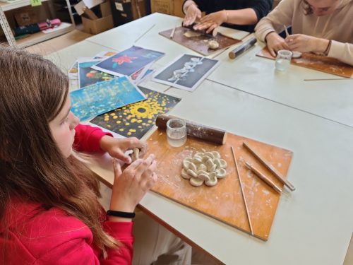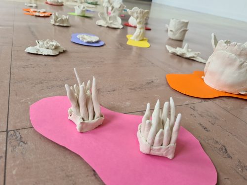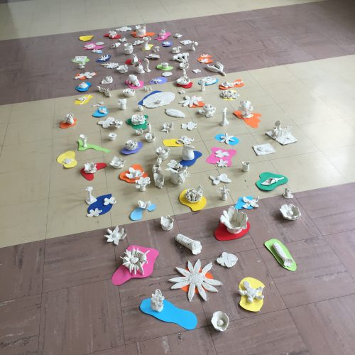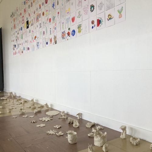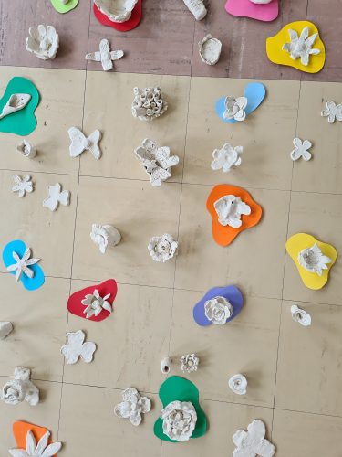 Dessins installés au mur et modelages au sol réalisés par les 5ème3 et 5ème4.