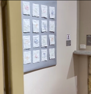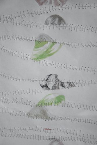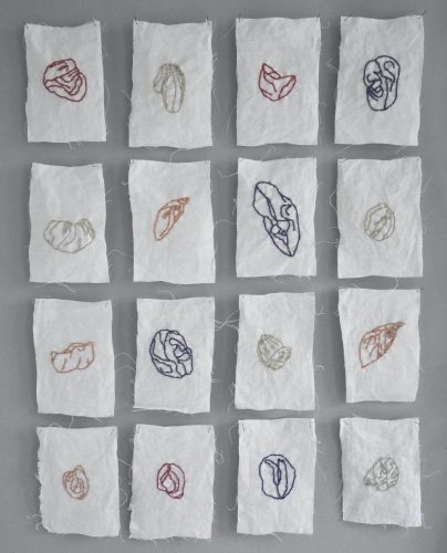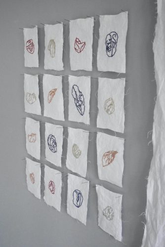 J’y présente, auprès de 31 artistes du collectif Réalités Nouvelles, une installation épinglée de dessins brodés de ma série Lambeaux, extraits de plis, de drapés (fil de coton sur lin,15×10 cm chaque, 2023) ainsi qu’un Lambeau rafistolé (encre et aquarelle sur papier recyclé, fil de couture, épingles entomologiques, 19x15cm, 2022-2023) :