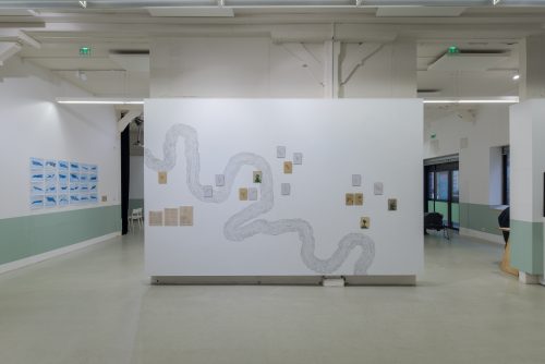 Pour le Forum de la Maison de l’architecture de Normandie, je propose un accrochage de mes dessins et photographies de la série Les Vagabondes, sur un grand motif mural éphémère, réalisé au fusain, reprenant les méandres de notre fleuve, la Seine.
